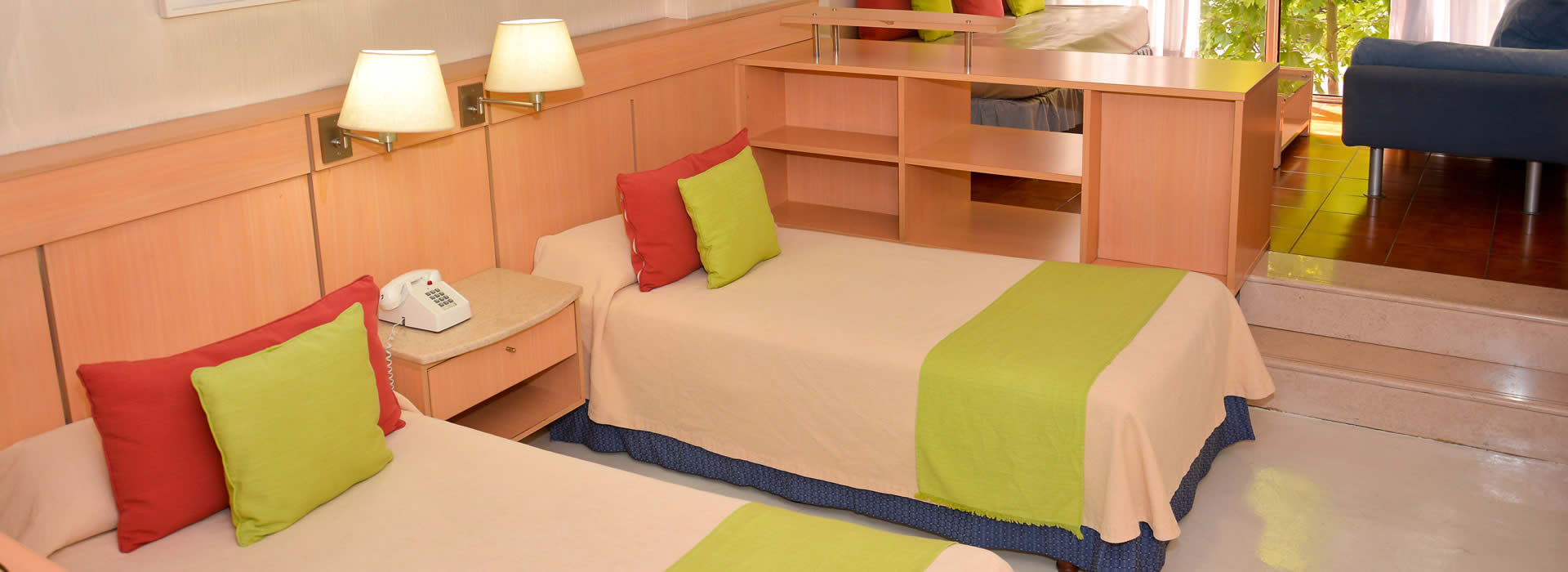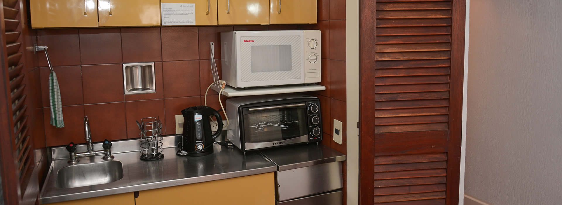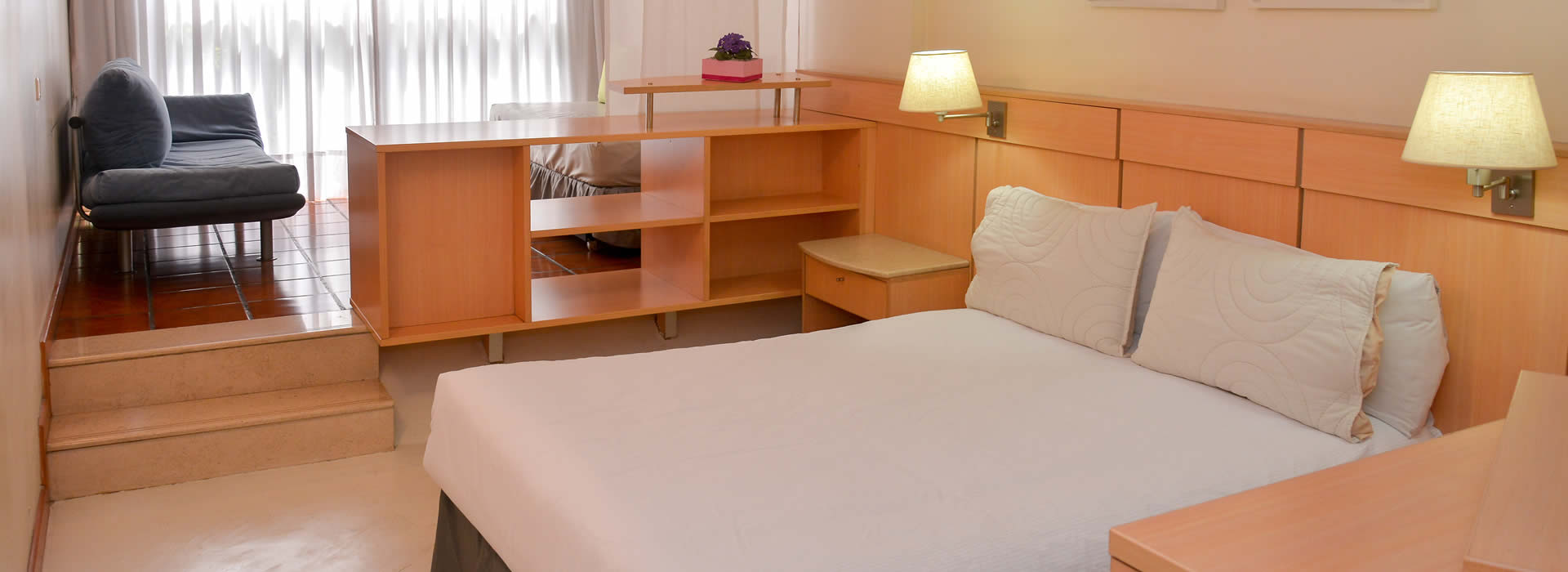 Kitchenette con heladera y microondas. Cama matrimonial o 2 camas individuales y sala de estar con diván cama.